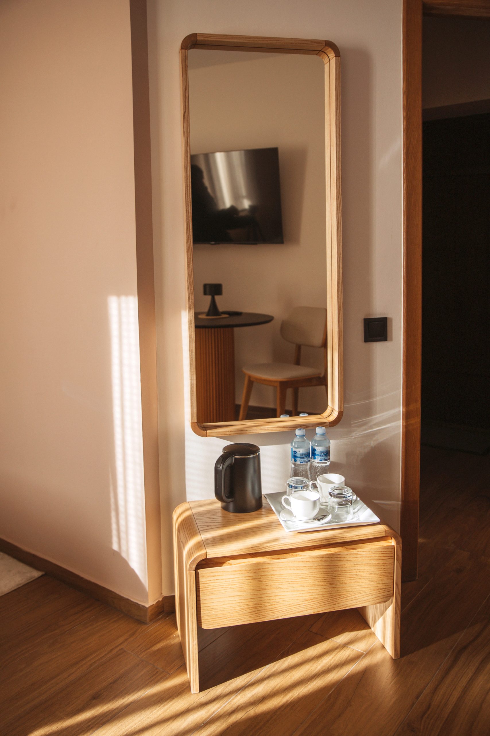 • Мінібар — охолоджені напої та необхідні дрібниці під рукою.
