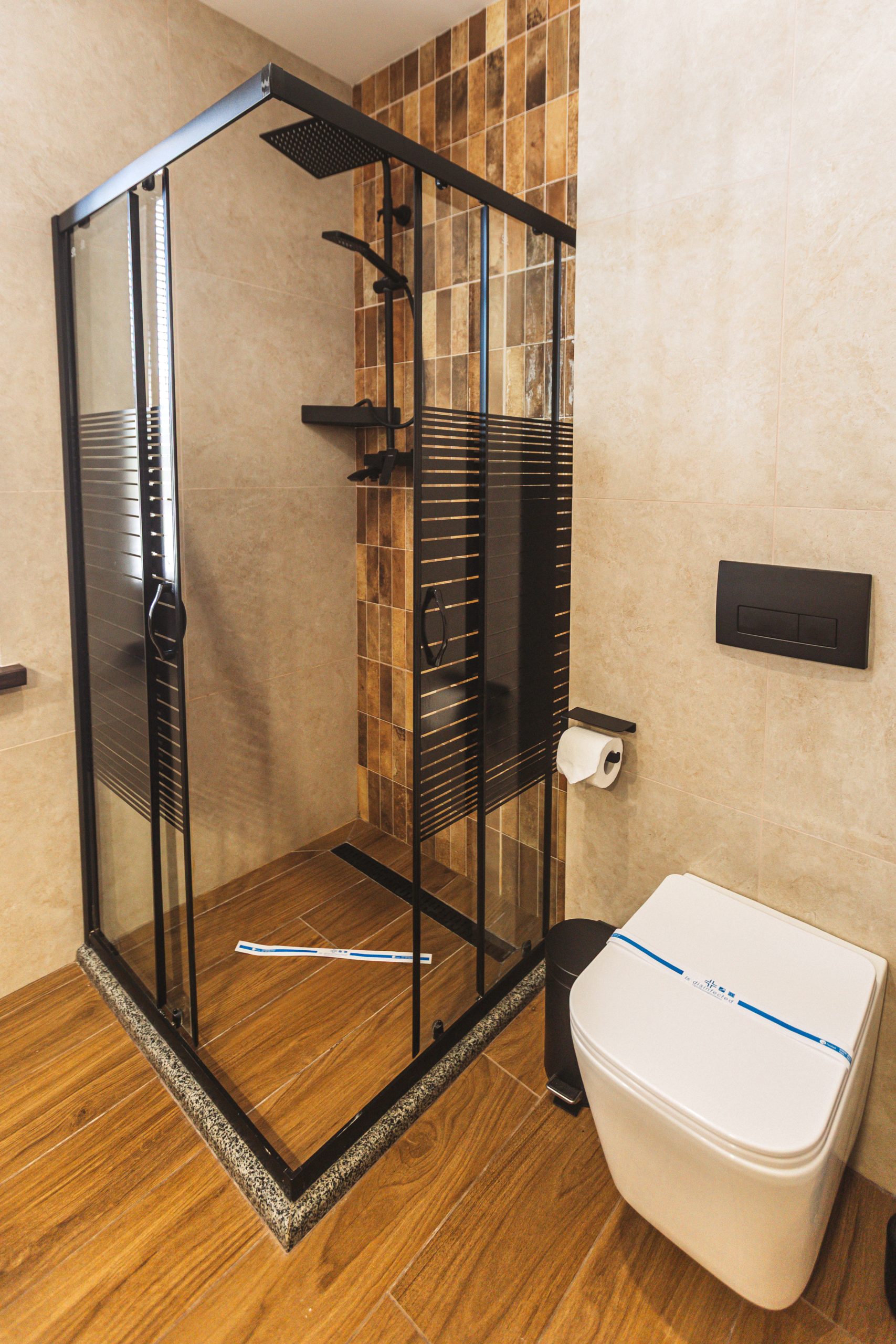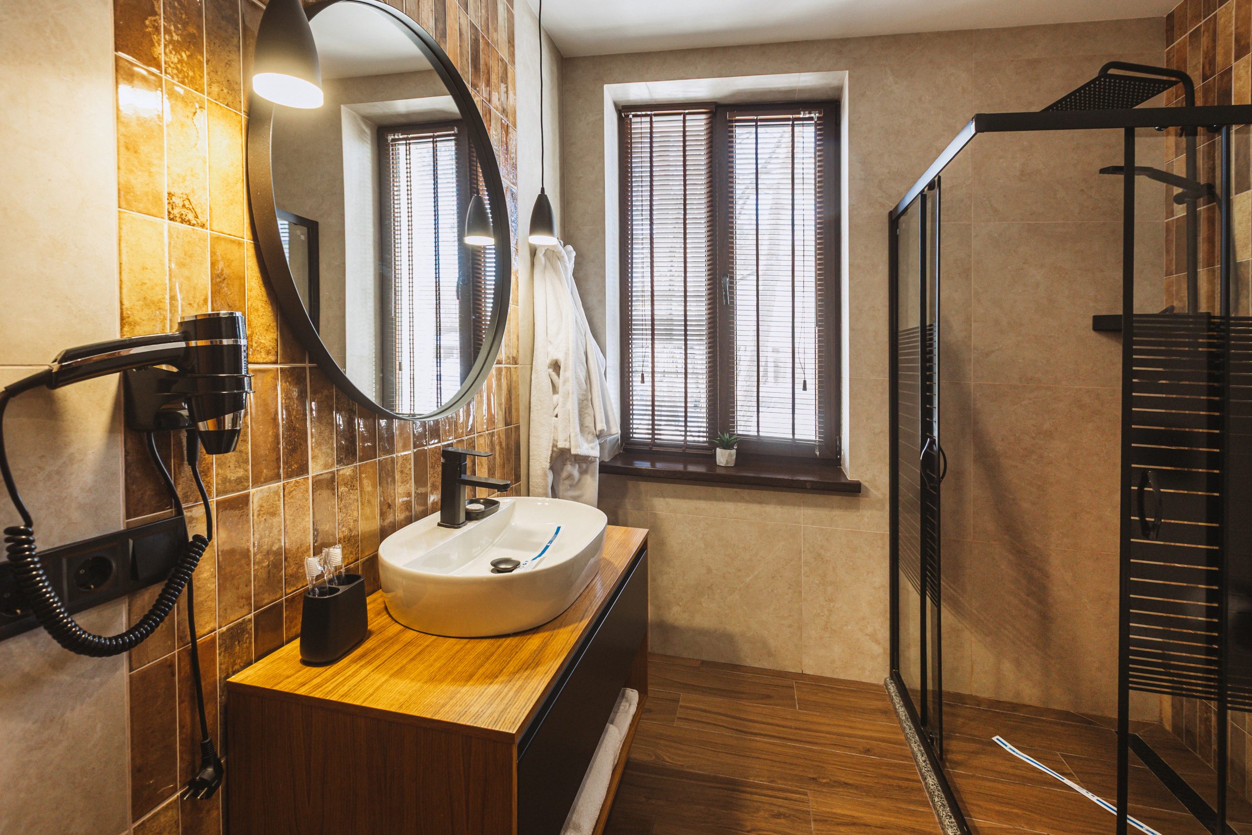 • Простора ванна кімната — душ із скляними дверцятами та якісна косметика.