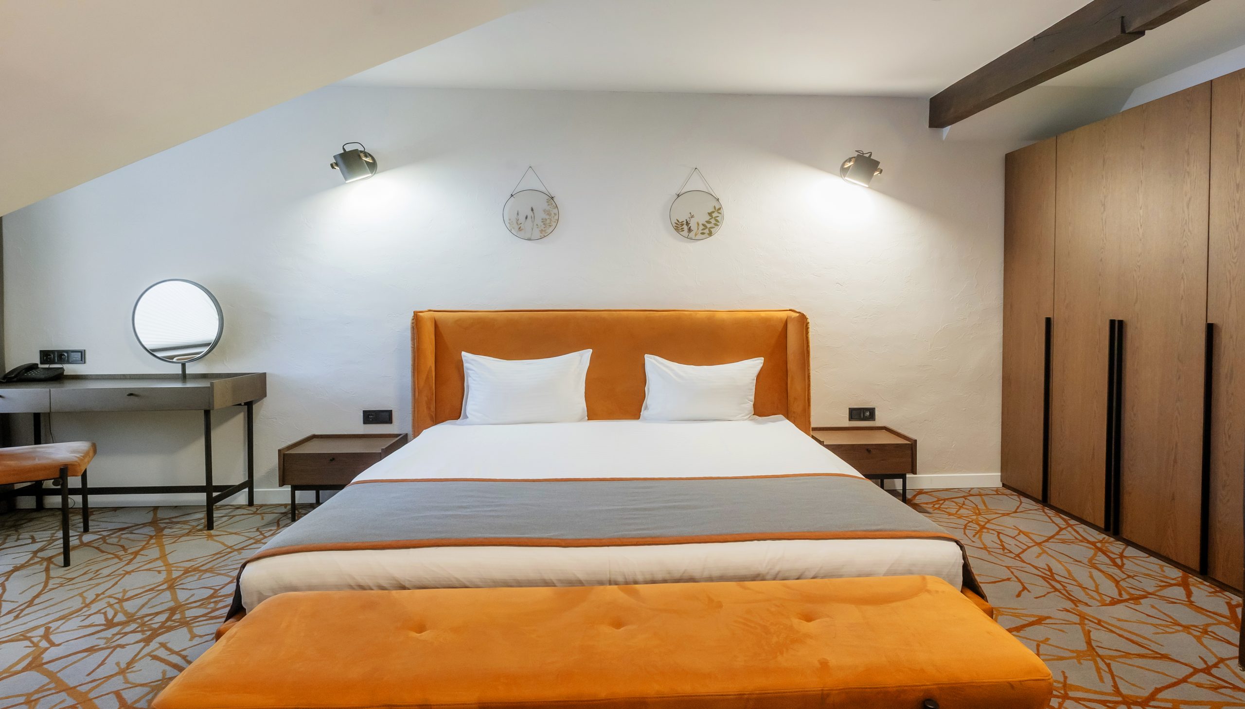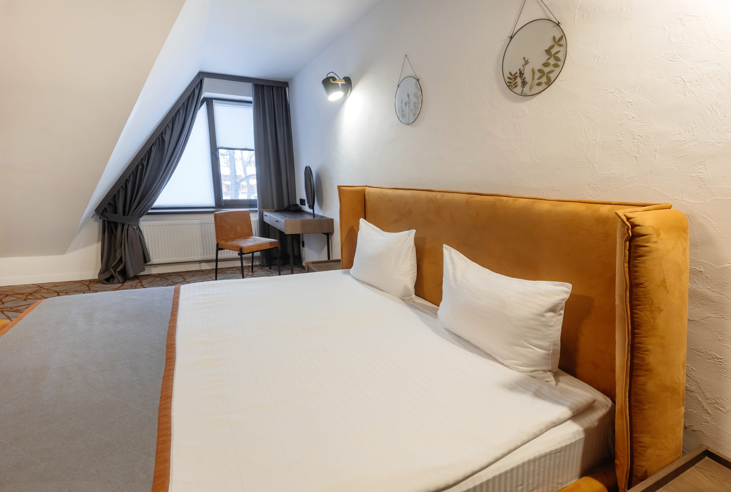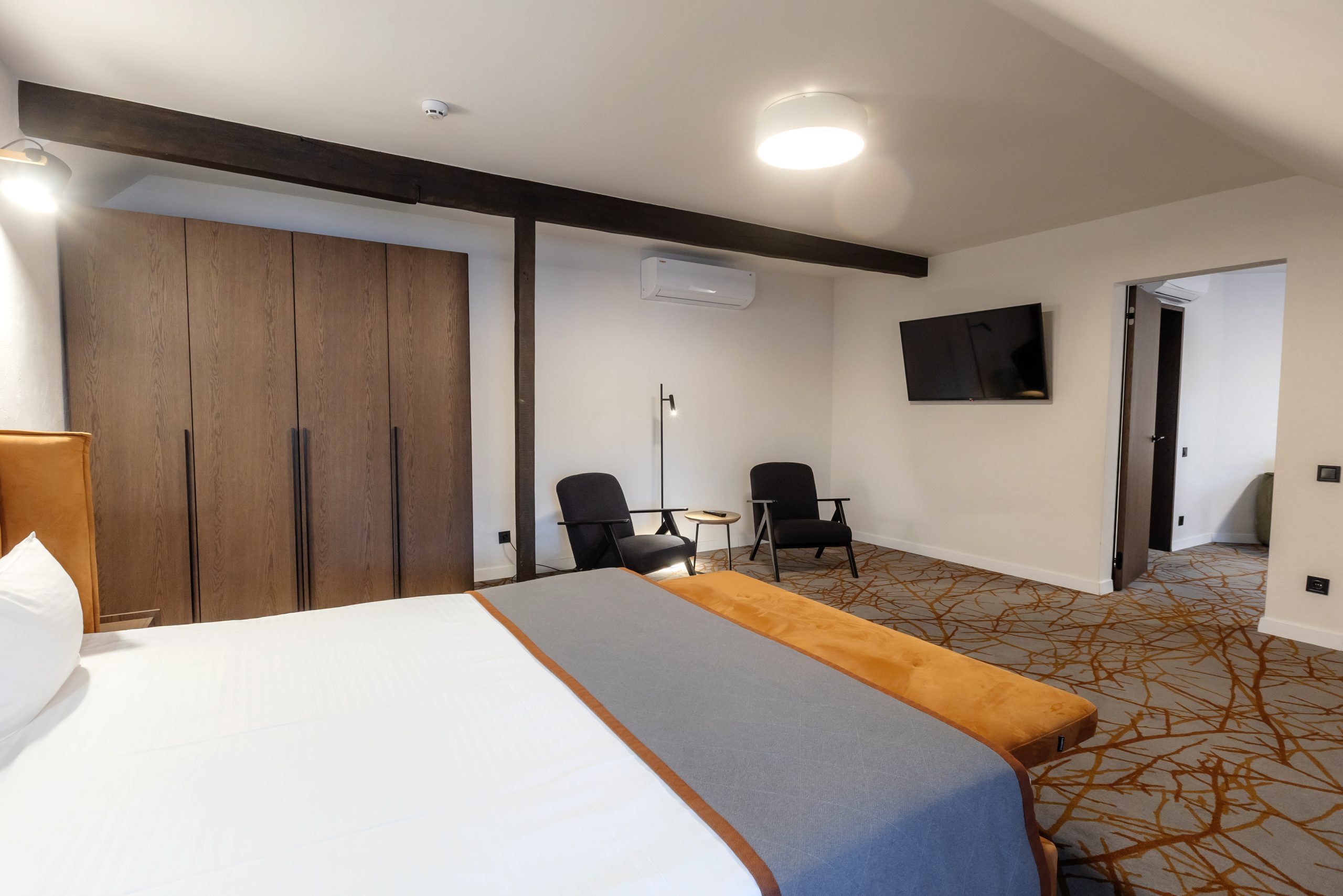 - Комфортне двоспальне ліжко — м’який матрац і бездоганна постіль для глибокого сну.