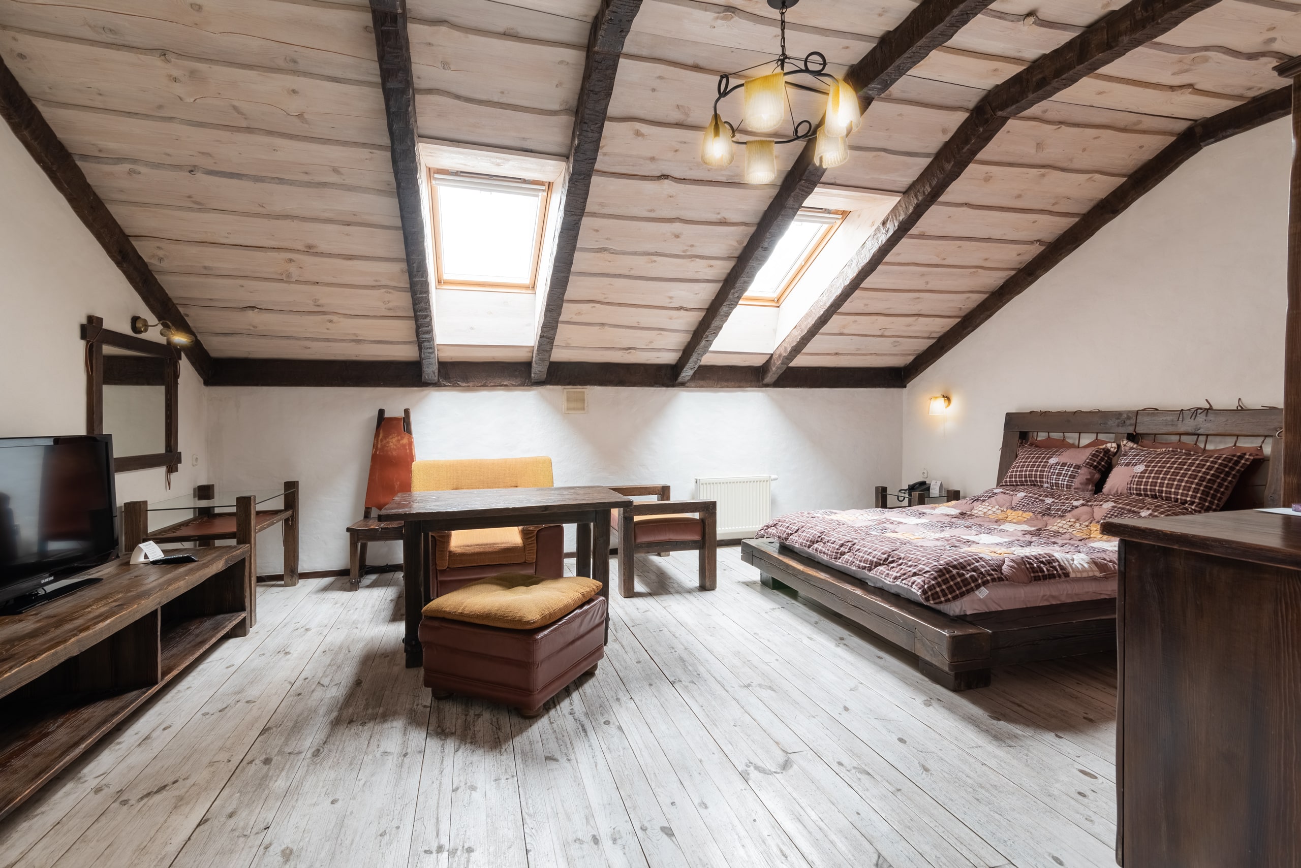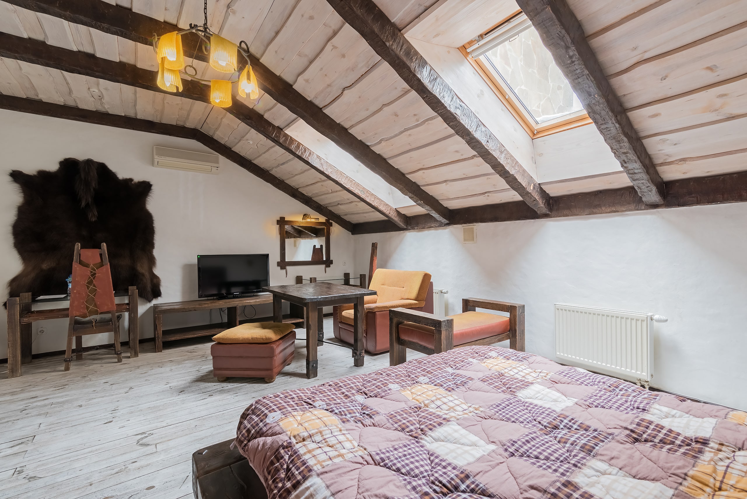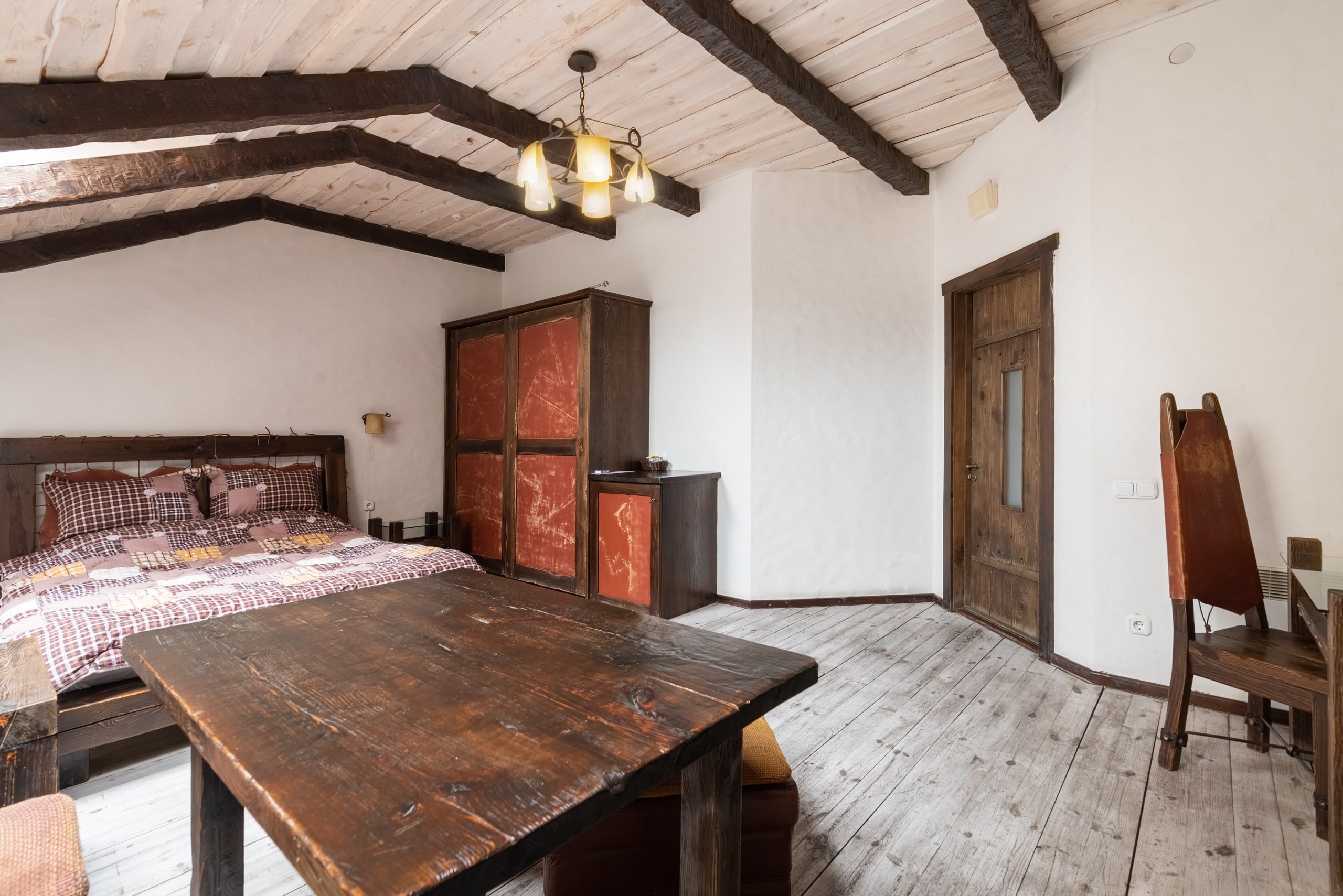 Затишний номер для проживання двох гостей, який вирізняється особливим характером і теплом. Інтер’єр виконаний у стилі мисливського будиночка: масивна деревина, фактурні елементи та декор зі шкіри створюють атмосферу усамітнення, спокою та справжнього природного комфорту.