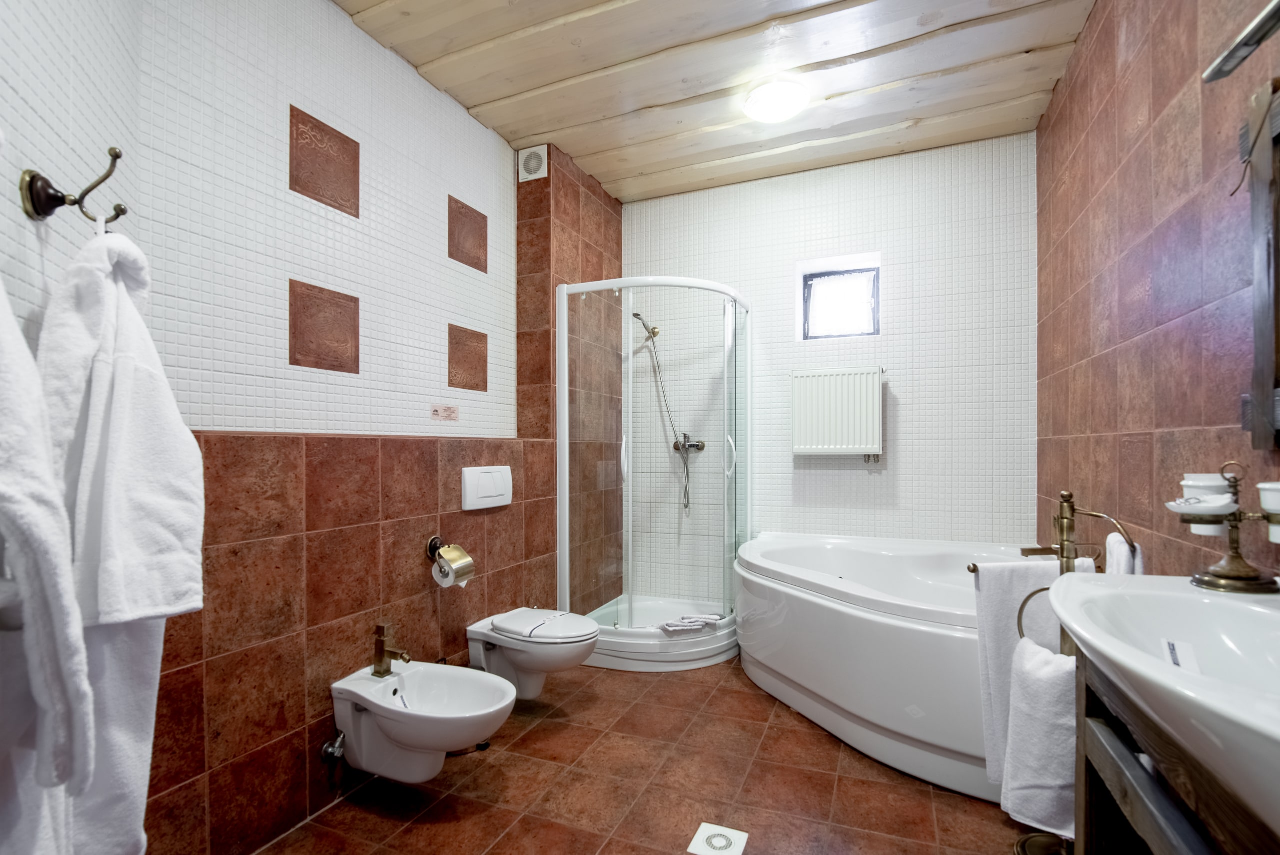 Простора ванна кімната обладнана душовою кабіною, кутовою ванною, умивальником, санвузлом і біде — для максимального комфорту під час відпочинку.